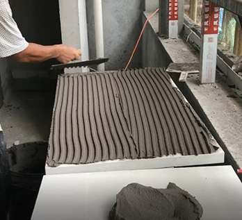 6.5.2.將粘貼砂漿在板材背面涂抹一層,注意完整涂覆,厚度一般在3-4mm左右,用10×10的鋸齒抹豎向立拉豎紋(和墻面紋路垂直);