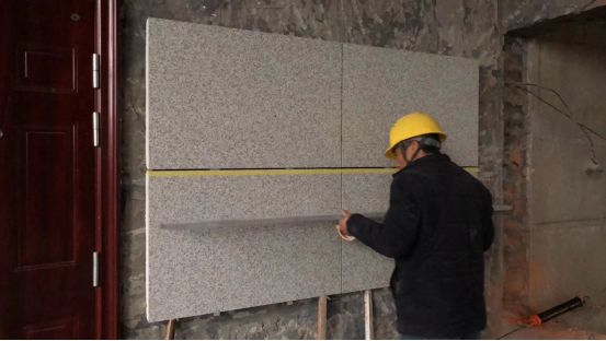 2. 根據設計要求,在保溫層粘貼基礎上,將陶瓷薄板保溫一體板立面鋪設到基層上,并用專用的膨脹螺栓將板材固定在基層上。