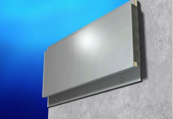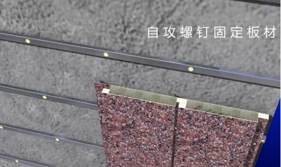 干掛型,這種安裝方式和石材干掛的方式有點類似,需要在墻體基層上預(yù)裝鋼制龍骨,外墻一體板通過特殊的專用錨固件與龍骨連接,一體板與墻體基層間通過填充發(fā)泡聚氨酯或其他材料。